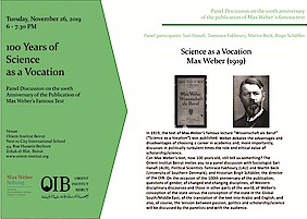 Can Max Weber’s text, now 100 years old, still tell us something? The Orient-Institut Beirut invites you to a panel discussion with Sociologist Sari Hanafi (AUB), Political Scientists Tamirace Fakhoury (LAU) and Martin Beck (University of Southern Denmark), and Historian Birgit Schäbler, the director of the OIB. On the occasion of the 100th anniversary of the publication, questions of gender, of changed and changing disciplines, of Western disciplinary discourses and those in other parts of the world, of Weber’s conception of the state versus the conception of the state in the Global South/Middle East, of the translation of the text into Arabic and English, and also, of course, the tension between passion, politics and scholarship/science will be discussed by the panelists and with the audience.