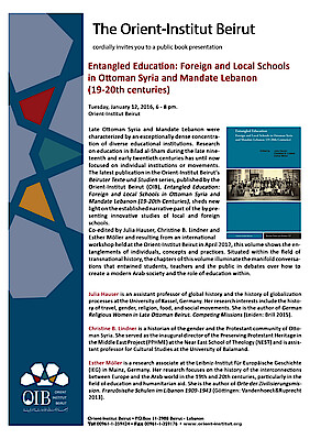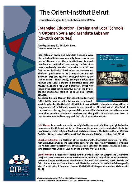 Late Ottoman Syria and Mandate Lebanon were characterized by an exceptionally dense concentration of diverse educational institutions. Research on education in Bilad al-Sham during the late nineteenth and early twentieth centuries has until now focused on individual institutions or movements. The latest publication in the Orient-Institut Beirut’s Beiruter Texte und Studien series, published by the Orient-Institut Beirut (OIB), Entangled Education: Foreign and Local Schools in Ottoman Syria and Mandate Lebanon (19-20th Centuries), sheds new light on the established narrative part of the by presenting twelve innovative studies of local and foreign schools.