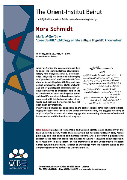 Nora Schmidt graduated from Arabic and German literature and philosophy at the Free University Berlin, where she also carried out her dissertation on early Arabic philology and late antique commentary culture. She is currently a postdoctoral scholar in the research group “From Logos to Kalām – linguistic knowledge from Late Antiquity to Early Islam” in the framework of the Collaborative Research Center Episteme in Motion. Transfer of Knowledge from the Ancient World to the Early Modern Period at the Free University Berlin.