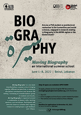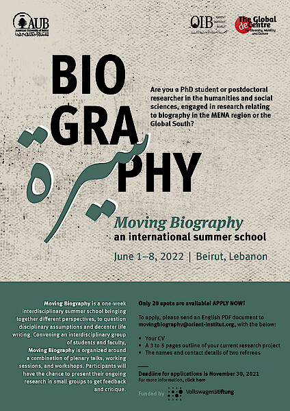 The Orient-Institut Beirut (OIB) in collaboration with the American University of Beirut (AUB) and the Global (De)Centre (GDC) invites doctoral and postdoctoral researchers to apply for an international Summer School, entitled Moving Biography, that will take place in Beirut/Lebanon from 1 to 8 June 2022.