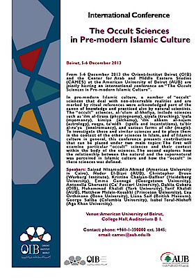 From 5-6 December 2013 the Orient-Institut Beirut (OIB) and the Center for Arab and Middle Eastern Studies (CAMES) at the American University of Beirut (AUB) are jointly hosting an international conference on “The Occult Sciences in Pre-modern Islamic Culture”.