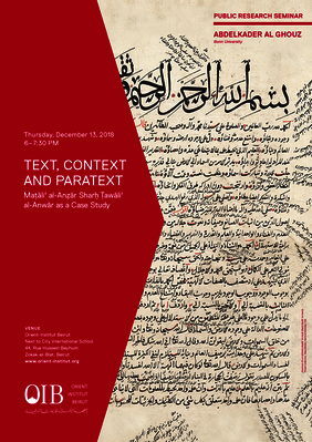 This talk is formed of three main parts: The first part expounds the content and the characteristics of the structure of the main text of the Ṭawāliʿ al-Anwār. Based on network analysis, the second part focuses on the social context of the commentary Maṭāliʿ al-Anẓār by examining al-Iṣfahānī’s interpersonal relationships with the Damascene and Cairene political and intellectual elites, which led to the composition of the Maṭāliʿ al-Anẓār and its diffusion in the Mamluk period. Using the literary concept of paratext, the third part of this paper sheds light on evidences, which are included in the colophon, introduction and reading marks on the margin of Maṭāliʿ al-Anẓār in order to reconstruct the social life and energy of one individual manuscript of the commentary under study.
