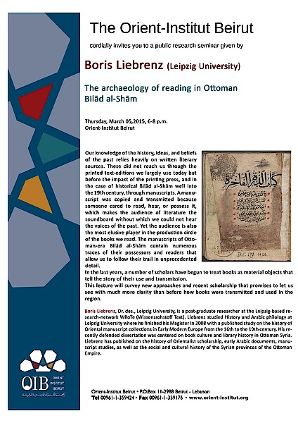 Boris Liebrenz, Dr. des., Leipzig University, is a post-graduate researcher at the Leipzig-based research-network WRoTe (Wissensrohstoff Text). Liebrenz studied History and Arabic philology at Leipzig University where he finished his Magister in 2008 with a published study on the history of Oriental manuscript collections in Early Modern Europe from the 16th to the 19th century. His recently defended dissertation was centered on book culture and library history in Ottoman Syria. Liebrenz has published on the history of Orientalist scholarship, early Arabic documents, manuscript studies, as well as the social and cultural history of the Syrian provinces of the Ottoman Empire.