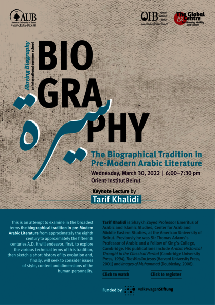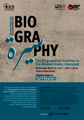 This is an attempt to examine in the broadest terms the biographical tradition in pre-Modern Arabic Literature from approximately the eighth century to approximately the fifteenth centuries A.D. It will endeavor, first, to explore the various technical terms of this tradition, then sketch a short his history of its evolution and, finally, will seek to consider issues of style, content and dimensions of the human personality.