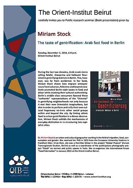 Dr. Miriam Stock is an urban and cultural geographer working in the field of migration, food, consumption and gender. She received her PhD in 2013 from the European University Viadrina in Frankfurt Oder. Since then, she was a Post-Doc fellow in the project “Global Prayers” (Forum Transregionale Studien, Berlin) as well as a coordinator of the participatory photography project “Blasti” on women and public spaces in Tunis. She co-organizes the international forum “Food Fabrication” in January 2015 at the Orient-Institut Beirut.