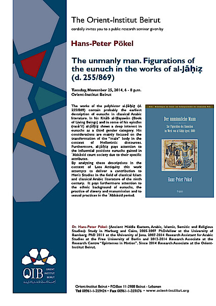 The works of the polyhistor al-Jāḥiẓ (d. 255/869) contain probably the earliest description of eunuchs in classical Arabic literature. In his Kitāb al-Ḥayawān (Book of Living Beings) and in some of his epistles (rasāʼil) al-Jāḥiẓ shows a deep interest in eunuchs as a third gender category. His considerations are mainly focused on the transformation of the “male” body in the context of Hellenistic discourses. Furthermore, al-Jāḥiẓ pays attention to the influential positions eunuchs gained in ʽAbbāsid court society due to their specific attributes.