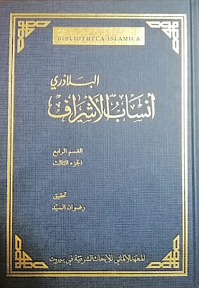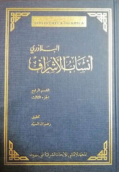 Ansāb al-ašrāf is a genealogical encyclopedia of the Arab-Islamic state. Its order follows that of Ibn al-Kalbī’s Ğamharat an-nasab, but Balāḏurī (d. 279/892) expands upon the biographies of the first four caliphs, as well as those of the ʿUmayyad and ʿAbbāsid caliphs, whenever their names appear within the genealogical scheme of the work.