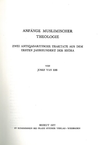 This work focuses on the early Muslim dispute against the qadarīya based on two manuscripts. Prof. van Ess illustrates this dispute based on the writing of Ḥasan b. Muḥammad b. al-Ḥanafīya in the first part of the volume. After introducing the author and its work, he illustrates the chosen manuscripts and offers a translation for them.