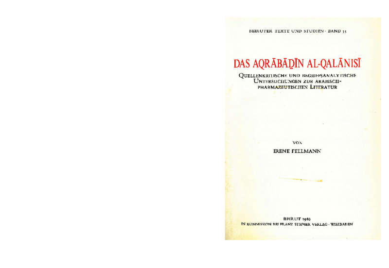 In her publication Aqrābāḏīn al-Qalānisī Dr. Fellmann analyses the sources and the lexicography found in the work of Badr ad-Dīn Muḥammad al-Qalānisī who lived in Samarkand at the end of the 6th/12th century. His work contains around 1200 receipts prepared for pharmacists. It contains no pharmaceutical theories, but simple medifications with their differences in conservations in confections.