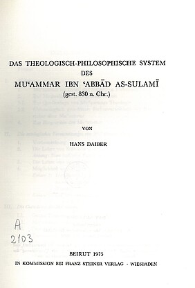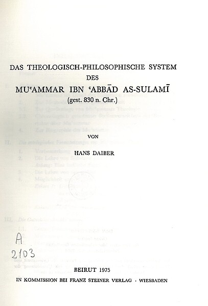 In his work, Daiber deals with the theological-philosophical ideas of Muʿammar Ibn ʿAbbād al-Sulamī, a leading Muʿtazilite of the 8th and 9th century. Daiber therefore analyses different aspects of the doctrine of al-Sulamī, for instance the doctrine of God, the physical worldview as well as the anthropology and his position to the imamate.