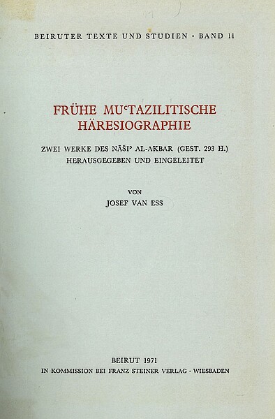 In his work, Prof. van Ess deals with the heretic writings of the muʿtazili scholar an-Nāšī (d. 293/905). These writings are Kitāb Uṣūl an-Niḥal and Kitāb al-Ausaṭ written by an-Nāšī. These are found in two manuscripts, which are presented and analysed by van Ess.